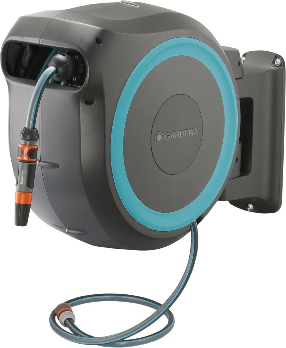 Met de wandslangenbox RollUp XL is het bewateren van een grote tuin aangenaam en eenvoudig. U bevestigt de compacte slangopslag permanent op de muur van uw huis en sluit deze met een aansluitslang aan op de kraan. Dankzij de 35 meter lange slang en de 180 graden draaibare slangenbox is het heerlijk om uw planten te bewateren en is dit geen corvee meer. De slangenhouder volgt uw bewegingsrichting en voorkomt dat de slang gaat knikken of in de war raakt. Nadat u de slang tot de gewenste lengte voor het bewateren hebt uitgetrokken, grijpen de zeer korte vergrendelingspunten zich automatisch vast en blokkeren ze de slang zodra u stopt. Door lichtjes aan het uiteinde van de slang te trekken, wordt het vergrendelmechanisme ontgrendeld en wikkelt een geïntegreerde stalen veer de verlengde tuinslang volledig automatisch, betrouwbaar en gelijkmatig voor u op. Dankzij de innovatieve RollControl-technologie gebeurt het oprollen veilig en gecontroleerd. De geïntegreerde slanggeleider zorgt ervoor dat de slang netjes en gelijkmatig wordt opgerold, zonder dat deze in de knoop raakt. De kraan- en slangaansluitingen van de slangenbox maken deel uit van het Original Gardena System, zodat u op elk gewenst moment andere GARDENA opzetstukken kunt aansluiten. U hebt altijd uw Gardena mondstukken bij de hand: ze kunnen onder de muurbeugel worden bevestigd en daar worden opgeborgen om ruimte te besparen. Het hoogwaardige materiaal is UV- en vorstbestendig en bestand tegen weersinvloeden. Daarom kan het systeem het hele jaar door worden gebruikt. Bovendien is de slangopslag beveiligd met een antidiefstalvoorziening. Alle benodigde aansluit- en montageonderdelen worden bijgeleverd in de wandslangenbox RollUp: een muurbeugel, een aansluitslang, alle benodigde Original Gardena System onderdelen en een mondstuk met twee verschillende sproeiopties. Gardena geeft vijf jaar garantie op de hoogwaardige slangopslag. Bewatering die altijd gebruiksklaar is , dankzij de Gardena wandslangenbox RollUp XL.