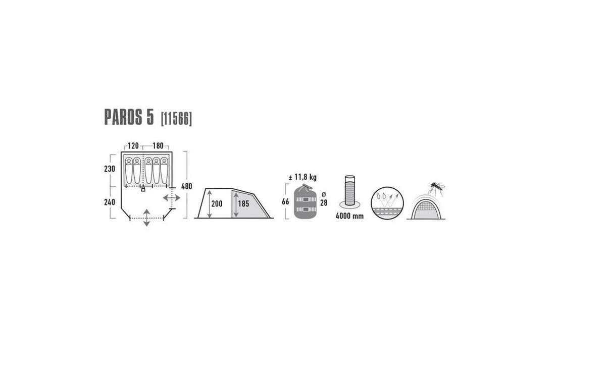 De Paros 5 van High Peak is een familie tunneltent met stahoogte. De grote voortent heeft naast de hoofdingang ook een zij-ingang wat voor veel bewegingsvrijheid zorgt en ook voor ruimte zorgt om rustig te zitten of om je spullen op te bergen. De muggengaas-zijdeur en het muggengaasvenster bieden extra ventilatie. De slikranden rond de voorbouw beschermen de tent tegen regen en modder. Het aan de binnentent vastgenaaide grondzeil kan niet verschuiven. De folievensters zorgen voor voldoende licht in de tent en zijn ook afdekbaar. 3 permanente ventilaties zorgen voor goede luchtcirculatie en een rustgevende slaap. Hou de ventilaties daarom ook altijd open. De tent beschikt over sterke ritssluitingen en reflecterende scheerlijnen voor meer zichtbaarheid. De zeer stabiele 5 mm staal-grondpennen gaan niet buigen bij een harde ondergrond. Voor het afspannen van de tent en het vastzetten van de scheerlijnen zorgen speciale 5mm staal-grondpennen met haken voor een betere grip in de grond. De afdekflap van de ritssluitingen heeft een regengoot die het indringen van water verhindert. De buitentent wordt eerst opgebouwd en dan wordt de binnentent erin gehangen, met als grote voordeel dat bij regen de binnententen droog blijven! De binnentent is uitgerust met de High Peak Vario Vent Control: de muskieteningang houdt vervelende insecten uit de tent en kan van binnenuit variabel bediend worden a.h.v. een afdekflap. Deze berg je makkelijk op in het daarvoor voorziene vak. De 2 hoge ventilaties verluchten de binnentent ook bij gesloten Vario Vent Control. De slaapruimte met geritste scheidingswand kan als één grote slaapkamer gebruikt worden of in 2 slaapruimtes gescheiden worden. De organiser, de extra opbergzakken aan de binnenkant en de lamphouder zorgen voor extra comfort. De naden zijn getapet en de tent is dus waterdicht. De Paros 5 biedt onderdak aan 5 personen en is perfect voor familiecamping. Compleet met haringen, scheerlijnen, compressiehoes, opzetstructies en onderhoudstips.
